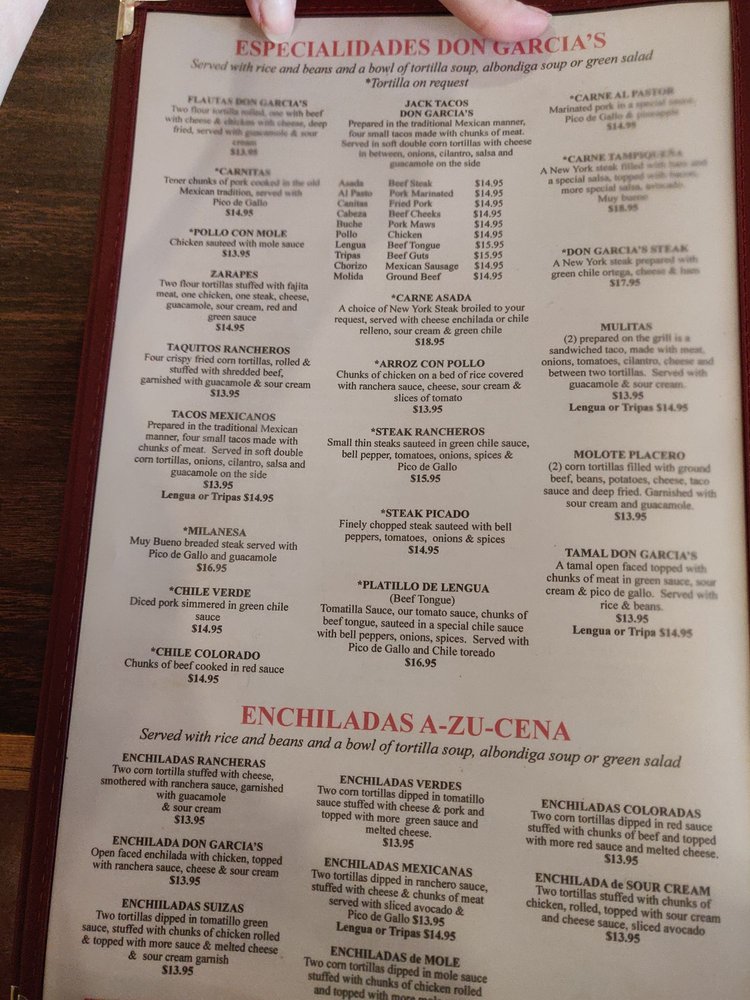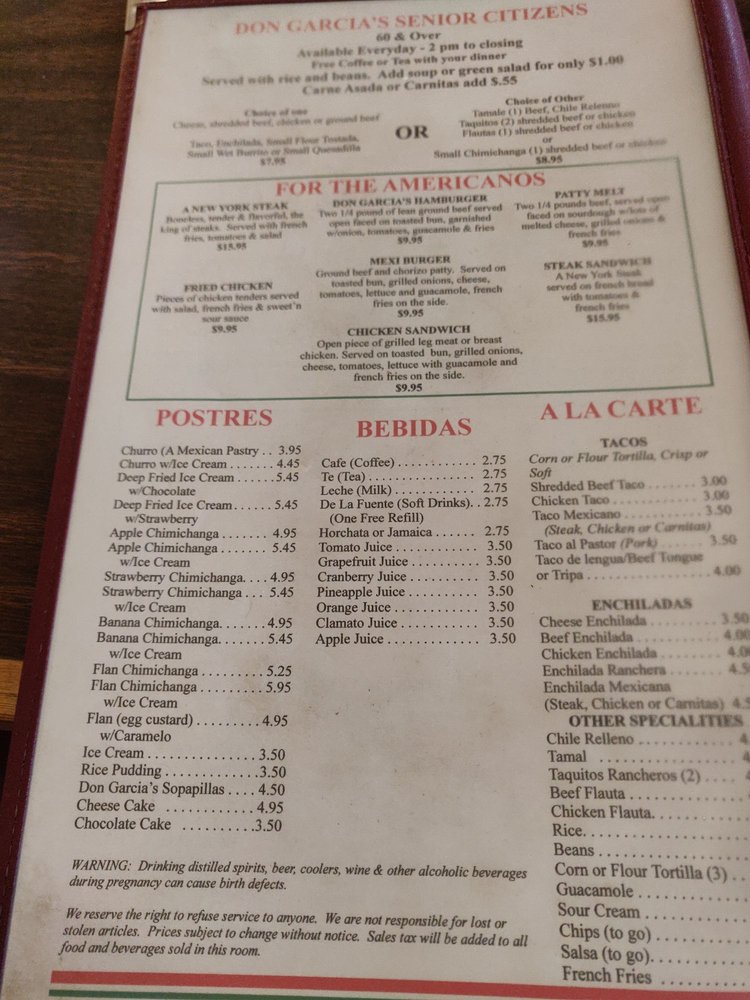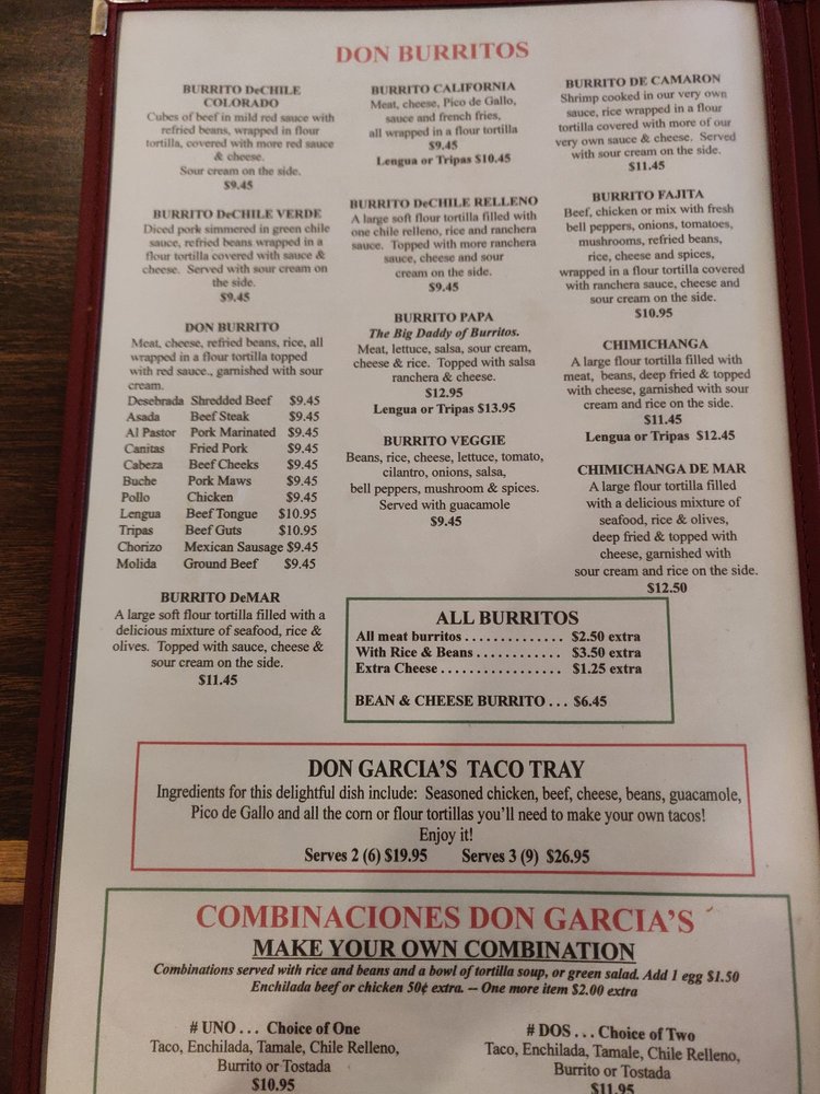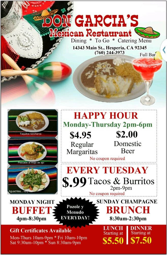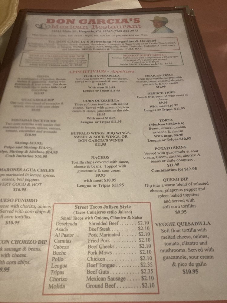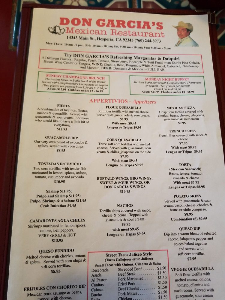 Don Garcias is a Mexican restaurant located in Hesperia, CA, offering a variety of dishes perfect for brunch, lunch, dinner, and dessert. The menu includes favorites like chicken fajitas, tamales, carne asada, chorizo tacos, and more. Customers praise the delicious homemade food, especially highlighting the tamales, molcajete, and chimichangas. The Sunday brunch buffet with menudo and pozole is a must-try. The friendly staff, including the owner Steven, provide excellent customer service, making every visit feel like home. Although some customers mentioned a bathroom odor upon entering, the overall dining experience and quality of food at Don Garcias seem to keep patrons coming back for more. Don Garcias is a go-to spot for flavorful Mexican cuisine and welcoming atmosphere.